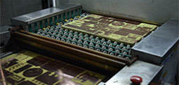 Stage 2 is to remove the unwanted copper from the panel using etching. Once this copper has been removed, the remaining dry film is then removed leaving behind the copper circuitry that matches the design.