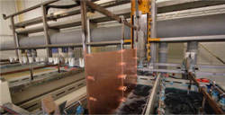 The first step in the plating process is the chemical deposition of a very thin layer of copper on the hole walls.