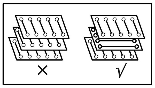 The routing directions of adjacent layers should be orthogonal to avoid the signal traces of adjacent layers running in the same direction, thus reducing unnecessary crosstalk between layers.
