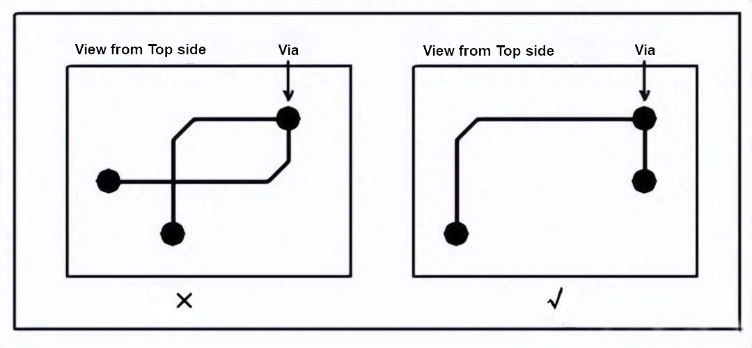 When designing PCB, we should pay attention to the situation where signal traces form self-loops between different layers. Especially when routing multi-layer boards, signal traces are routed between layers, which has a greater chance of forming self-loops. Self-loops can cause radiation interference.