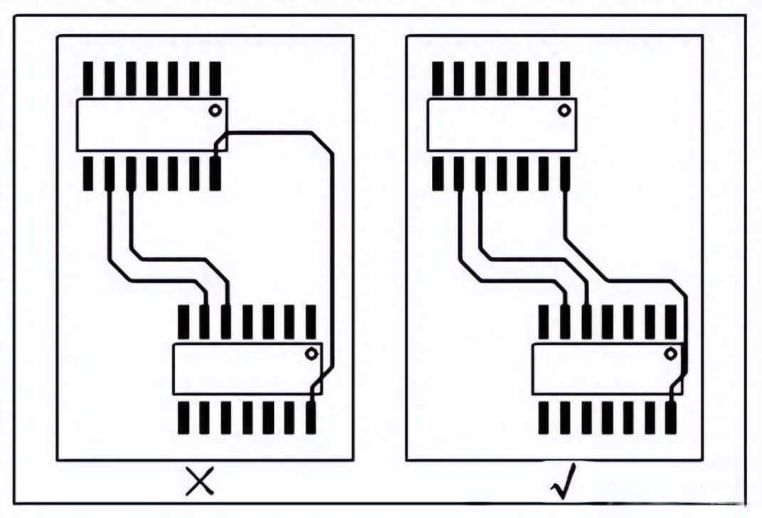 The routing width in the same network should be kept consistent. Changes in trace width can cause non-uniform characteristic impedance of the circuit, leading to reflections when the transmission speed is high. This should be avoided in the design whenever possible. Under certain conditions, such as structures similar to lead-out traces of connectors or the lead-out traces of BGA packages, changes in trace width may be unavoidable, so the effective length of the inconsistent sections should be minimized.