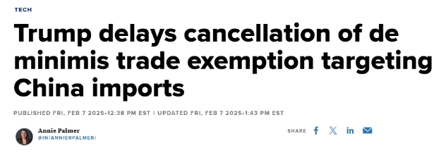 Here is the news link:https://www.cnbc.com/2025/02/07/trump-delays-ending-of-de-minimis-trade-exemption-targeting-china.html.