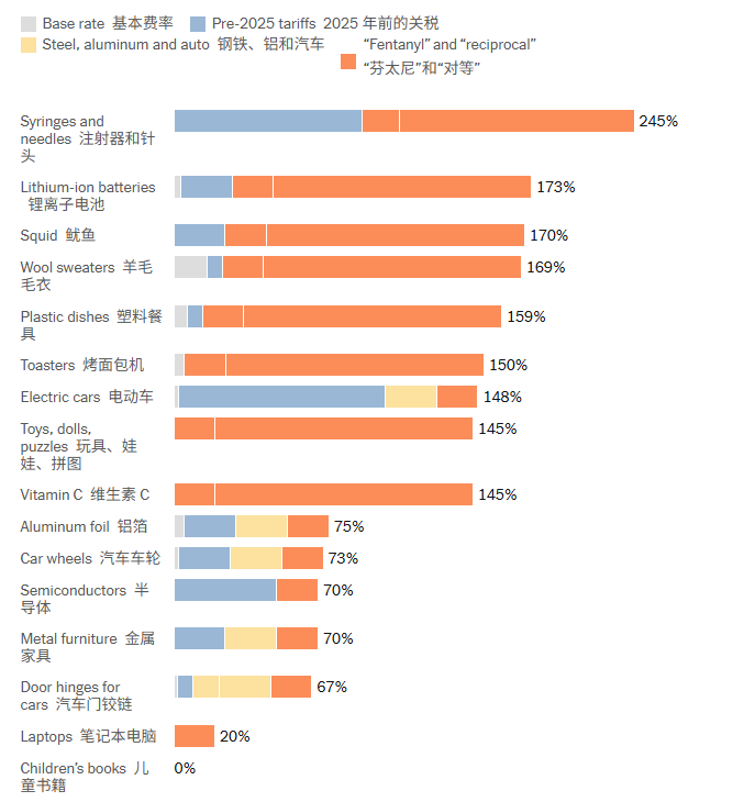 20% (fentanyl) +125% equivalent tariff +25% (if 301 surcharge is involved) + most-favored-nation rates ranging from 0 to 6.5%, with some combined rates reaching 145% to 176.5%