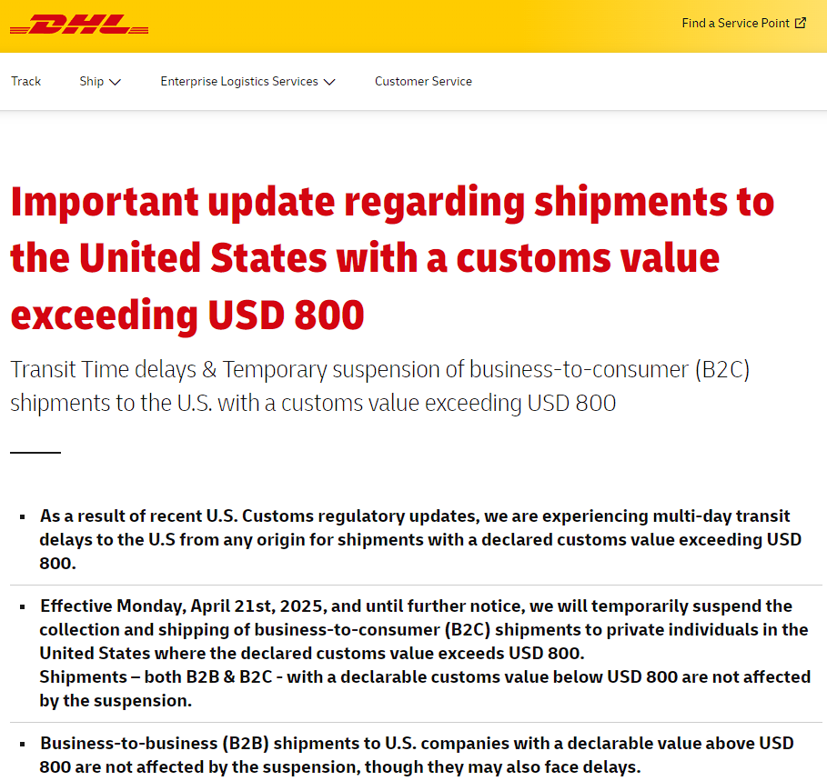 The latest B2C logistics policies of DHL and FedEx for shipments to the United States.