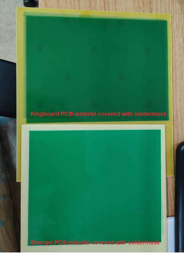 • Kingboard PCB material covered with soldermask vs. Shengyi PCB material cover with soldermask