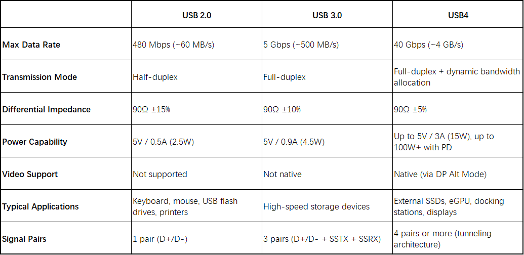 Key Parameter Comparison: USB 2.0 vs USB 3.0 vs USB4
